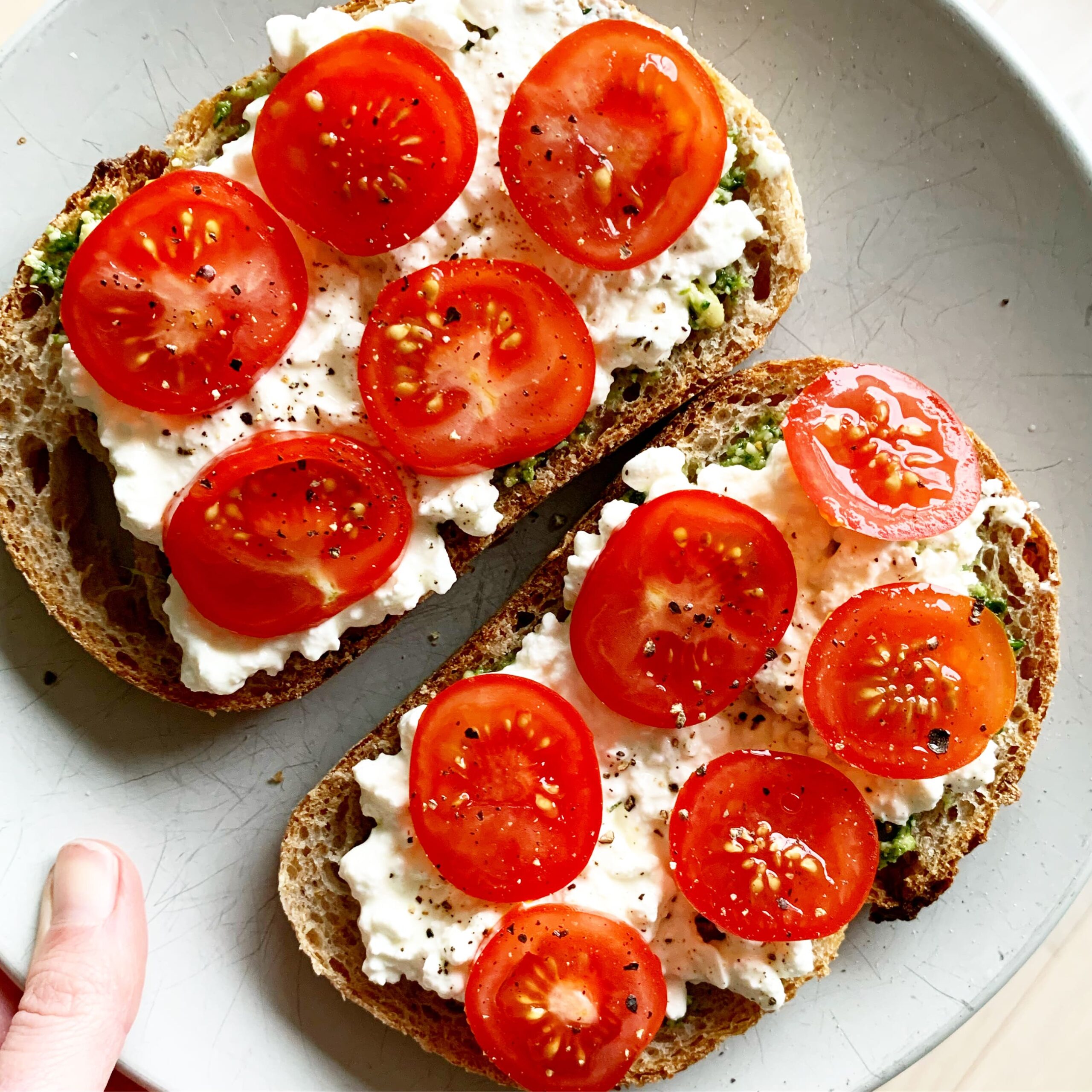 Deze caprese toast is echt heel snel te maken en super lekker. Je kunt de Hüttenkäse ook vervangen door geitenkaas, fetakaas, ricotta, plantaardige cream cheese of bijvoorbeeld avocado.