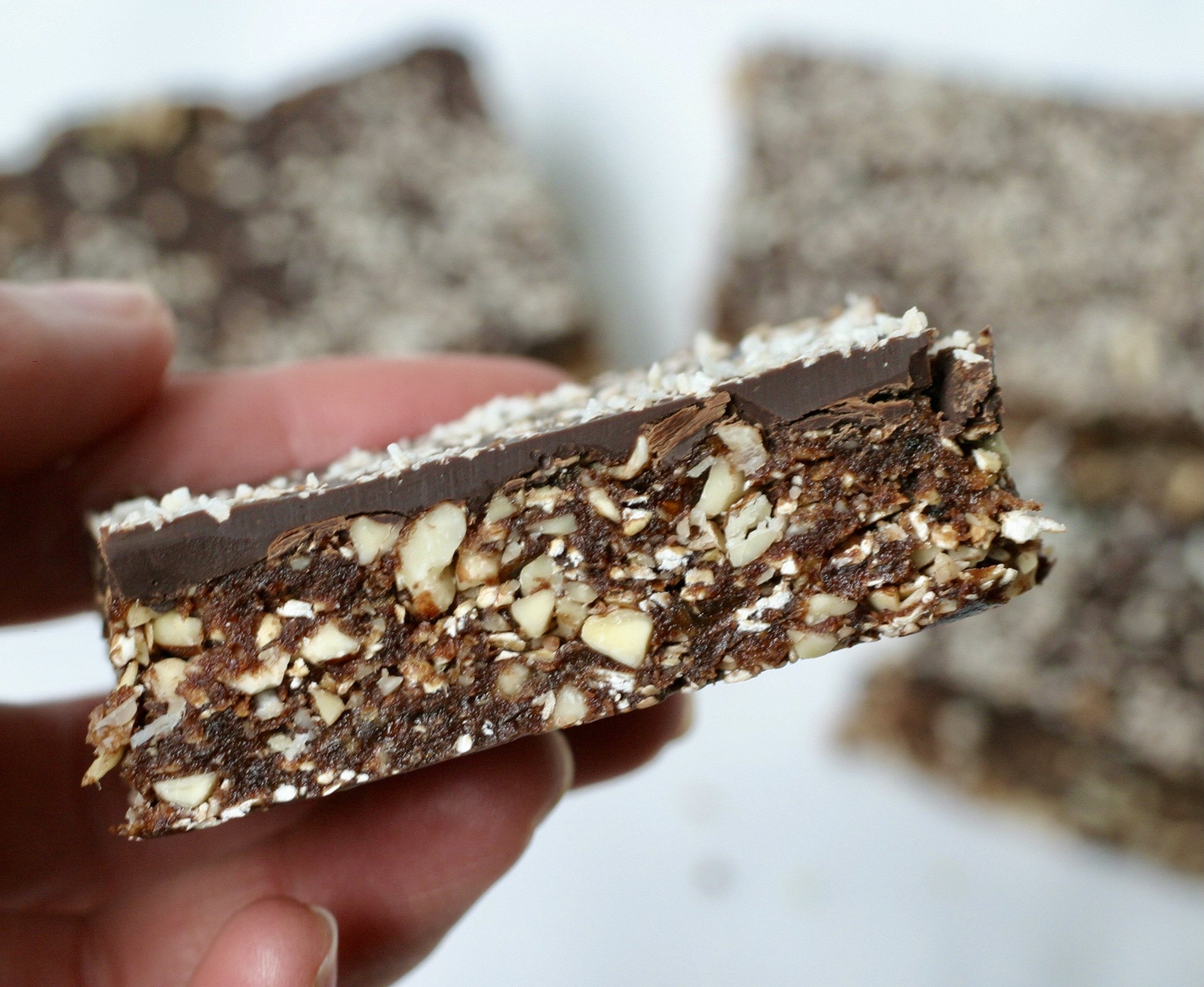 Meestal lig ik tijdens de zomermaanden op het strand, maar met dit weer vind ik het helemaal niet erg om de keuken in te duiken en nieuwe recepten uit te proberen. Deze chocoladerepen zijn echt fantastisch lekker (als je tenminste van chocolade houdt) en de havermout en de noten maken deze reep lekker voedzaam. Nog een voordeel; de repen heb je binnen 10 minuten gemaakt.