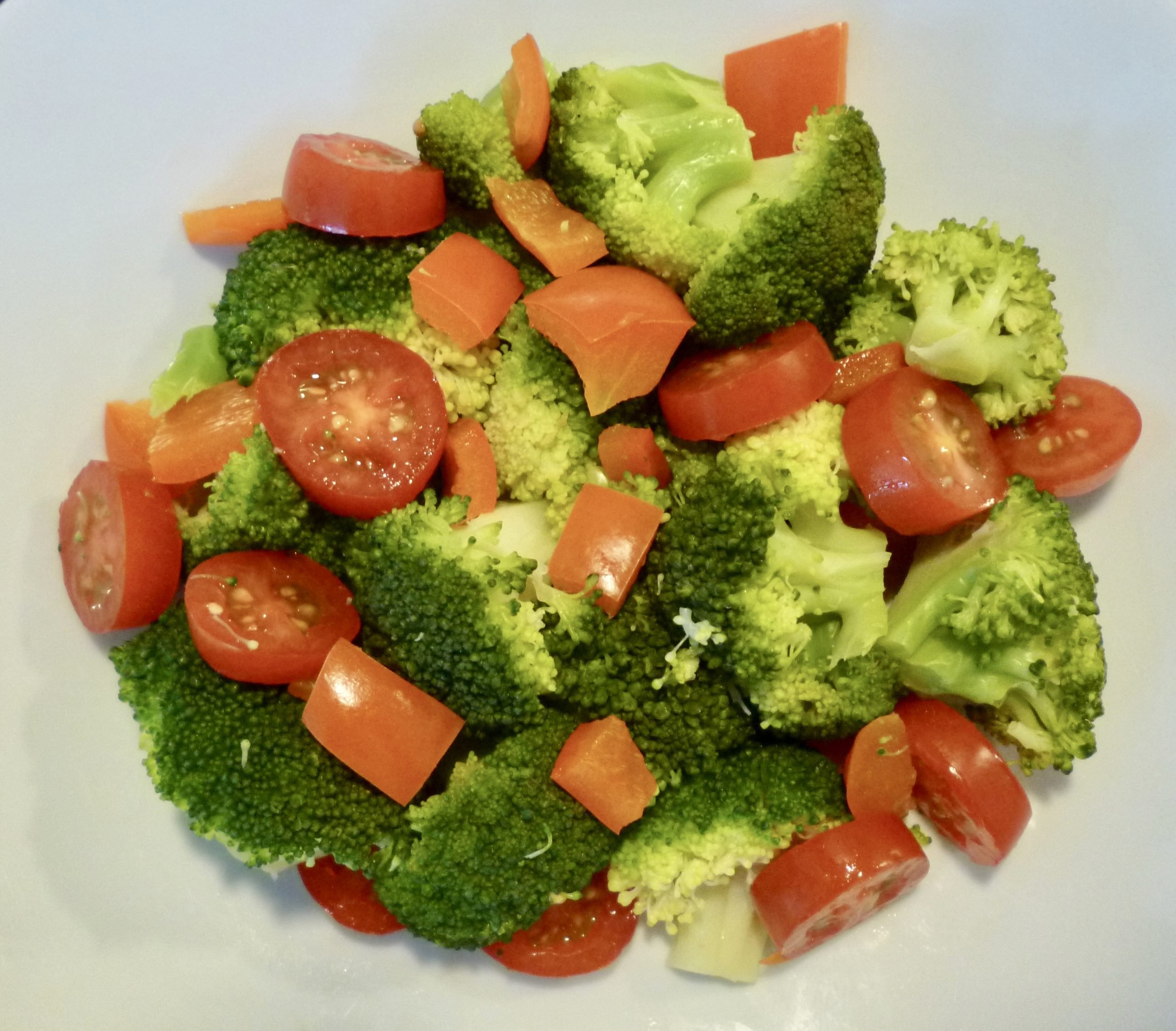 - Meng de broccoliroosjes met de paprika en tomaat en breng eventueel op smaak met zeezout en versgemalen zwarte peper.